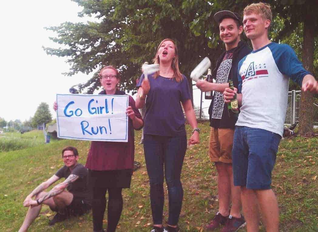 Eine Ecke weiter wartete die erste Überraschung: Da riefen Leute wie irre meinen Namen und ich sah ein riesiges Schild: Go Girl! Run! – Wie geiel! Da standen tatsächlich meine Mam mit Freunden aus Rostock und Berlin. Wow und ein großes Kullergrinsen!