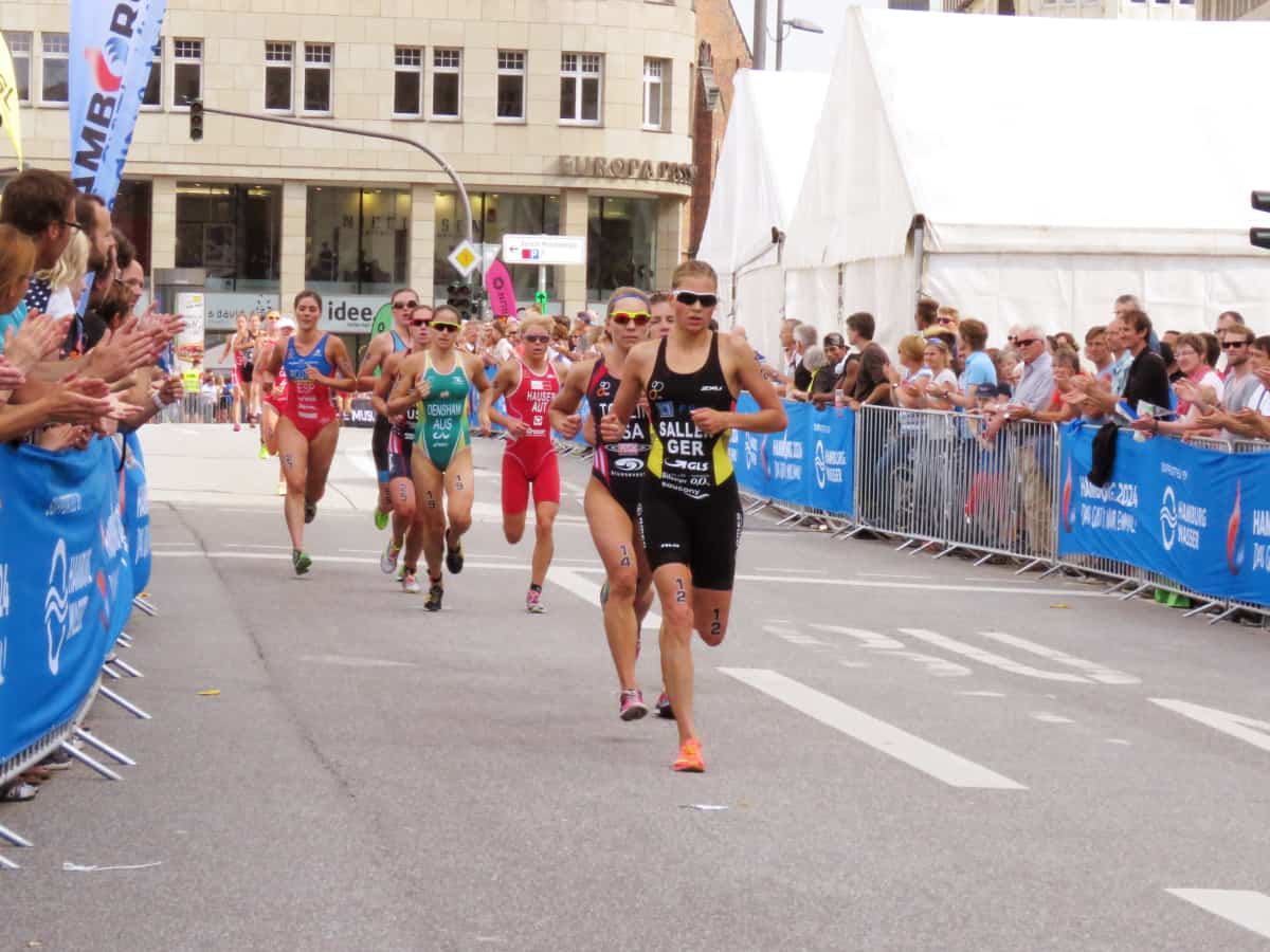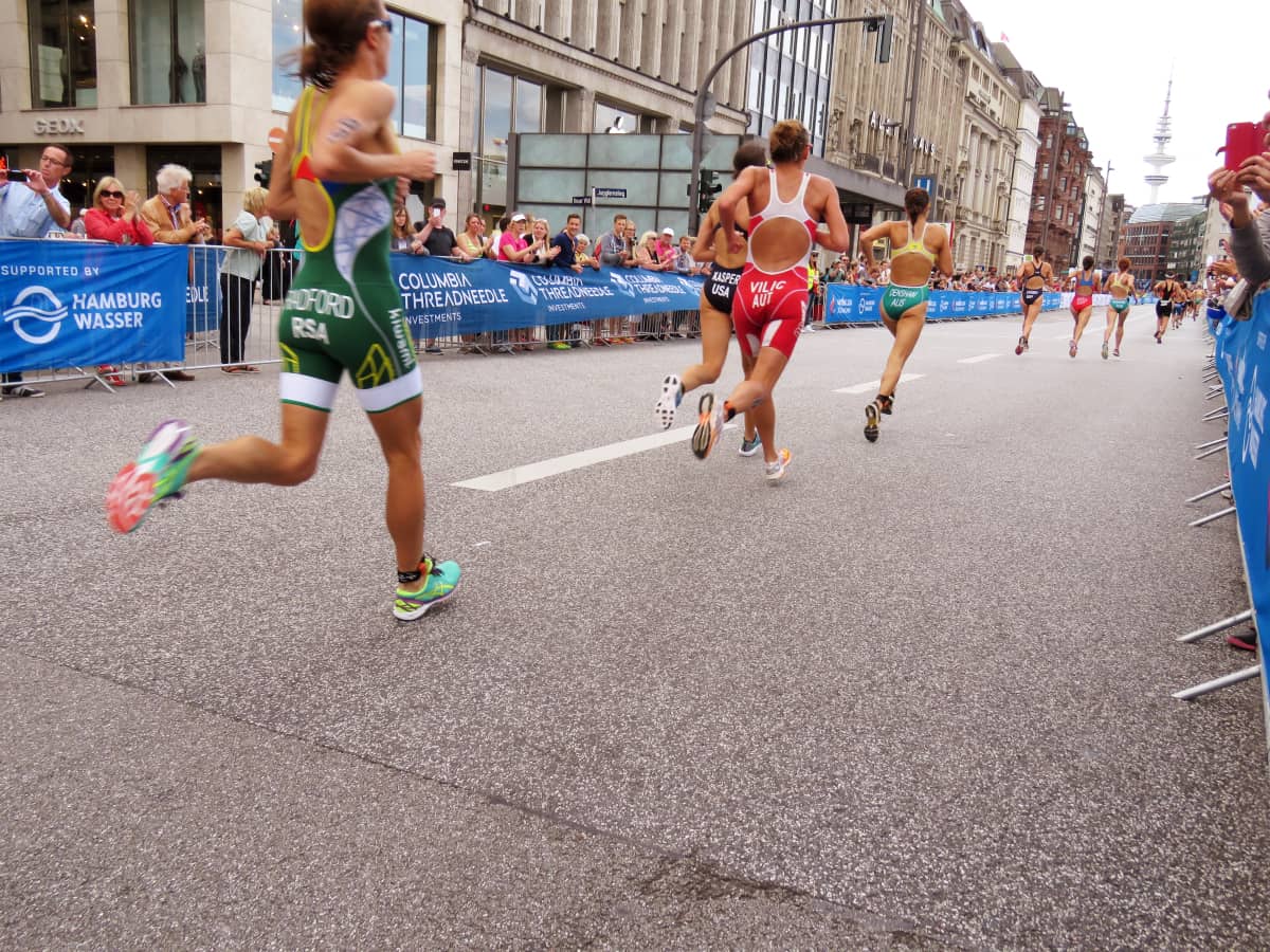 Bevor am Nachmittag die Elite an den Start geht, wird für die 750 Metern Schwimmen, 20 Kilometer Radfahren und 5 Kilometer Laufen noch einmal umgebaut, denn nun verläuft die Radstrecke mehrmals durch die Hamburger Innenstadt. Ein sehr kurviger Kurs, aber die Zuschauer wollen die Elite mehr als einmal sehen und kräftig anfeuern. Und so fliegen die Damen bereits um 15.45 Uhr förmlich durch die Alster, jagen in einem Tempo über den Gänsemarkt bei dem man hinter jeder Kurve einen Sturz vermuten könnte und rennen so schnell an uns vorbei, dass ich kaum überblicke, wer nun führt. Der Wahnsinn! Am Ende siegte die Amerikanerin Gwen Jorgensen.