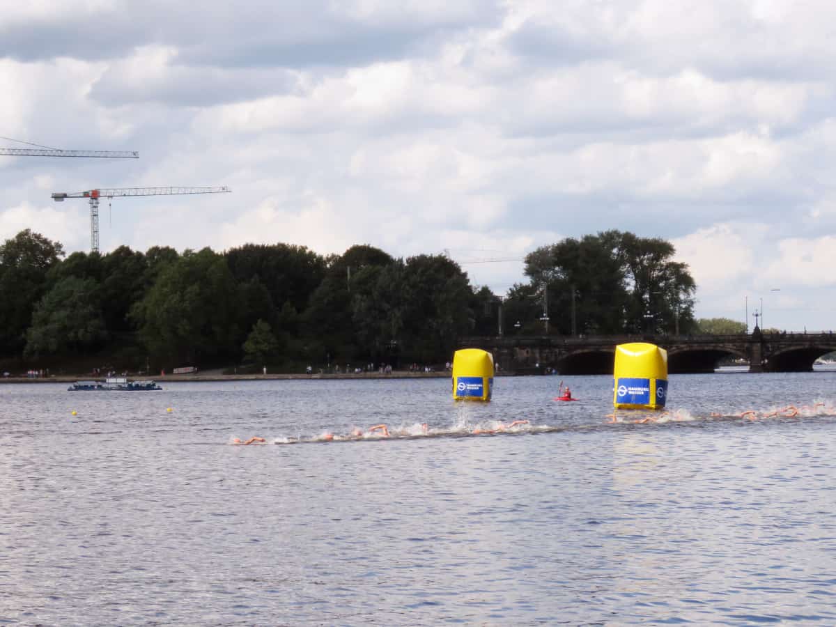 So auch in Hamburg, wo am Samstag die Sprintdistanz über 500 Meter Schwimmen, 22 Kilometer Radfahren und 5 Kilometer Laufen und am Sonntag die Olympische Distanz (1,5 km Schwimmen, 40 km Radfahren, 10 km Laufen), rund 10.500 Teilnehmer an die Startlinie lockten. Das kommt nicht von ungefähr! Denn Hamburg gilt als schönste Strecke. Triathlons werden oft an den Stadtrand verbannt, doch in Hamburg findet das Rennen mitten in der City statt. Die Alster als Schauplatz der Schwimmdistanz, dann geht’s aufs die Radstrecke, die einmal an der Elbe entlang bis nach Teufelsbrück und zurück in die Altstadt führt von wo aus die Teilnehmenden auf die Laufstrecke gehen. Und hier geht’s richtig grandios her: Tausende bejubeln die Läuferinnen und Läufer, am Ausgang der unendlich langen Wechselzone warten Trommler. Hamburg ist einzigartig!